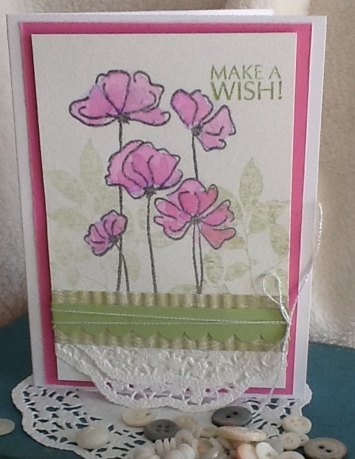 Hero Arts has a three in a row Tic Tac Toe June card layout challenge. I selected to design a card that used circles, background stamp and watercolors. I used a Hero Arts script background stamp and watercolored the paper with Ranger distress inks. The I added the dot flowers and watercolored the circles to . A tied silver cording added the final touch. Love the way the blues and greens blended together.