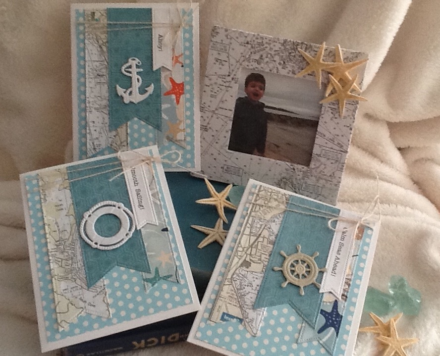 I was challenged to create a paper related crafting project for Scrapbook Cove for the August class schedule. I knew that using nautical navigational map was going to fit into the line up. I created a map covered picture frame and related projects. I created three different cards using nautical die cuts, patterned paper and a word banner. I love the way they came out. Check out my Instagram account #espressoexpressions for my cards and pictures.