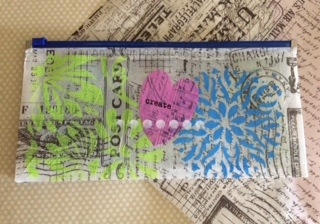 I attended a fabulous workshop at Scrapbook Clubhouse on Sunday and I learned how to create a new look on a plain old plastic cosmetic pouch. The awesome Tim Holtz special tissue paper and the heavy duty paste medium adhered the thin and strong paper to the plastic. Embellished with marker drawn flowers, or stenciled with acrylic paint transformed the plain old pouch. Fabulous. Here is my version using a $1.00 pencil case from Staples! I used stencils and paint and a cut out hearts. I was even able to stamp on the painted paper with Archival ink! I see these on my Christmas/holiday gifts to share with friends! Hope you like my simple and inexpensive version!