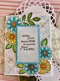 This stamp set and coordinating dies are a new addition to my stamping studio and they are titled Stitched Flowers from My Favorite Things company. I even had the chance to visit the flagship store- Awesome!- on a recent visit to Florida. What a beautiful store! What a treat to see samples and ideas and go shopping. Here is my submission for the card sketch challenge-MFTWSC375 and color challenge-#89. I think it works for both categories this week. I used Neenah white paper and colored the flowers and leaves with Copic markers. I love how the colors blend. I used a sentiment for the front and added lightly stenciled accents and a few Nuvo drop accents.