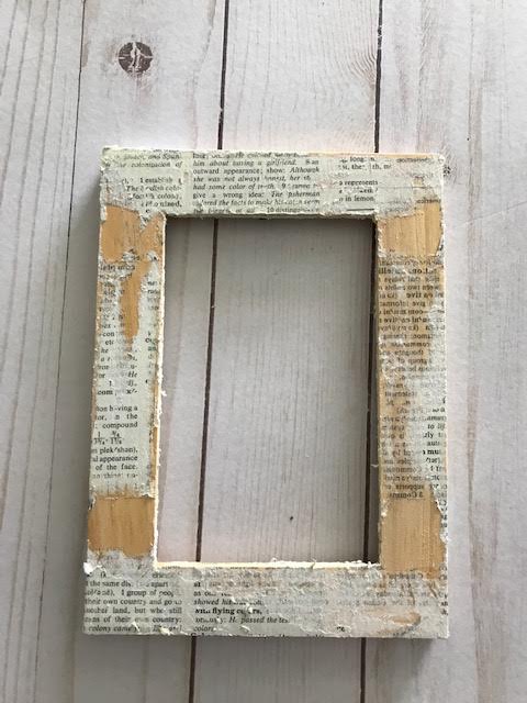 This picture frame started out as a simple wooden 5 x7 frame from a long ago project that I had covered with several different papers. The challenge was to remove the layers of glued paper to reveal the wooden frame. After sanding and wetting the frame and sanding again, I finallywas back to the original unpainted frame. Then I gave the frame a coat of white acrylic paint to prep for the next step of the upcycled frame.