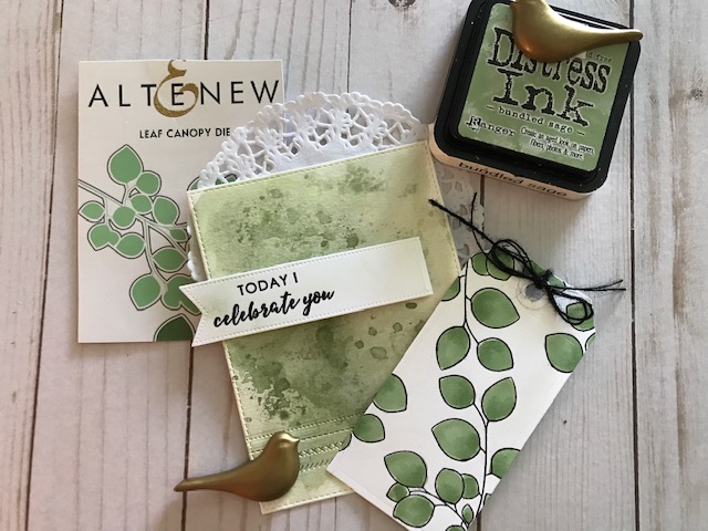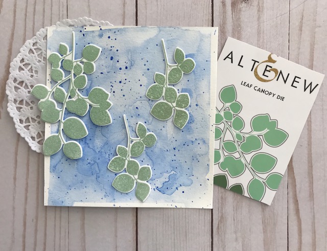 Now I was ready to create the card using the painted background paper and the embossed leaf clusters. I die cut the background paper using the stitched edge die from My Favorite Things . I stamped the sentiment “Enjoy The Little Things” from the Altenew Charmed stamp set and was a great match to the theme of the card which was Encouragement. I trimmed the leaf clusters to fit onto the blue paper and added the sentiment. Love the simple card layout and vibrant shades of green.