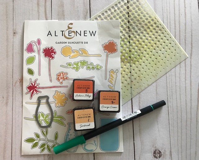 I colored the stems with a Tombow green brush tip maker and inked the flowers with three shades of orange Altenew ink cubes. I drew a light pencil line for a blue table where the vases would sit. I used a wash of the blue distress ihk to create the table surface and used a wet paint brush to paint in the table line.
