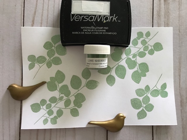 I tried Peppered Turquoise Opaque, Golden Cadillac, Lime Sherbert, Copper Tex Opaque and Lime Sherbert embossing powders. I selected the Lime Shebert as it had a nice textured green and had a shine when embossed. I stamped the leaves using Versamark embossing ink and heat set the stamped branches with the Lime Sherbert embossing powder.