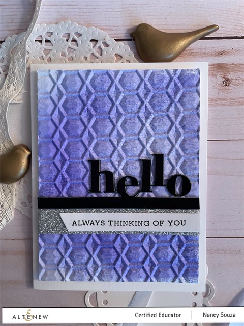 For the third card, I used the Altenew’s 3D Gems embossing folder and heavy weight watercolor paper. This type of embossing folder creates a deep impression and heavy weight paper works well. First, I inked my glass work mat using Altenew dark blue ink cube and sprayed it with water and dragged the paper through the ink puddle. I continued to add ink to cover the quarter sheet of paper. I dried the paper using a heat tool and set it aside. I die cut the Hello from glossy black paper for the top layer and cut another from regular black paper for added dimension and glued them together, I stamped a mini word banner and trimmed it. I used Altenew’s silver glitter washi tape as an accent. I trimmed the embossed and inked paper so there was a white edge for the card front. The Hello word die and sentiment were from Altenew’s Hello and word set.