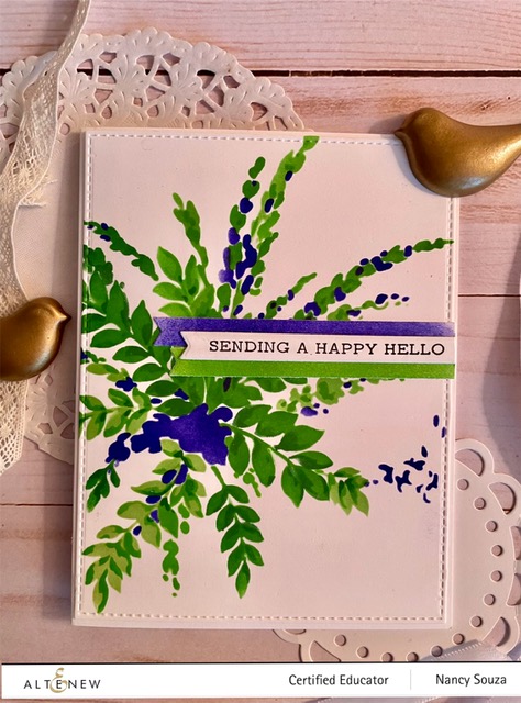 For the second card, I used Altenew’s 6 x 6 five layering stencil Meadow Burst on a half sheet of white card stock as this was a large stencil. I used Altenew mini ink cubes- shades of green and dark blue as the accent color. I also used the same ink colors to create two accent narrow banners for the stamped word banner. I trimmed and die cut the stenciled piece for an A2 card and added the three mini banners. Change up the ink colors and you have a totally different card.