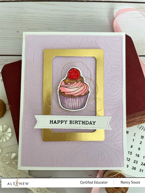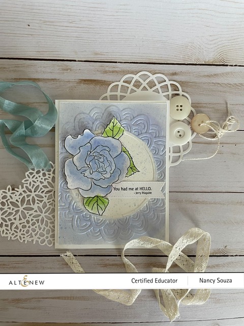 The focal point of this card is the Altenew Scalloped Frame Geometric 3D Embossing Folder. I used a piece of watercolor paper, sprayed a light mist of water before embossing. That was a helpful suggestion from the class. While I was waiting for the paper to dry, I stamped the rose on watercolor paper and painted it using Altenew ink cubes in shades of purple. I used the same ink colors to paint the embossed scalloped frame. I splattered on the piece including the space in the middle. I added a stamp sentiment banner, I added this inked piece to an A2 white card base, then added the rose with foam tape and tucked the tag behind the flower. I added an extra leaf for a trio of leaves. I kept the color scheme monocromatic for the card theme. The embossed scalloped paper was the showcase piece of the card!