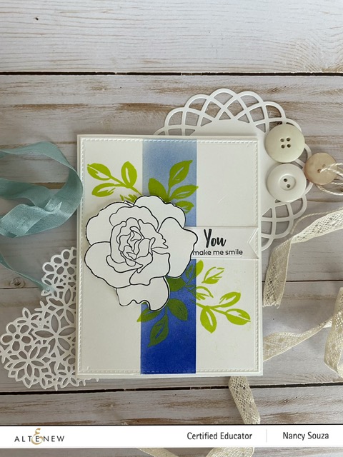 This ink blending technique created a colorful masked stripe. I used wide Post It paper tape to mask off the section that I ink blended using Altenew blue ink cubes going from darkest to lightest. I stamped two leaf sprigs from the Morning Flowes layering stamp set with bright green ink. I stamped the rose from the same stamp set as the first card and fussy cut the rose. I stamped a word tag and tucked it behind the fussy cut the rose and layered it with foam tape. This was a great technique!