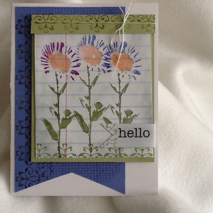 I printed the hello banner on the computer and cut it to size. I also colored the sides of the paper with Ranger Ink in a blue/gray color, tied a simple cord on the top and it is ready to send to a friend.