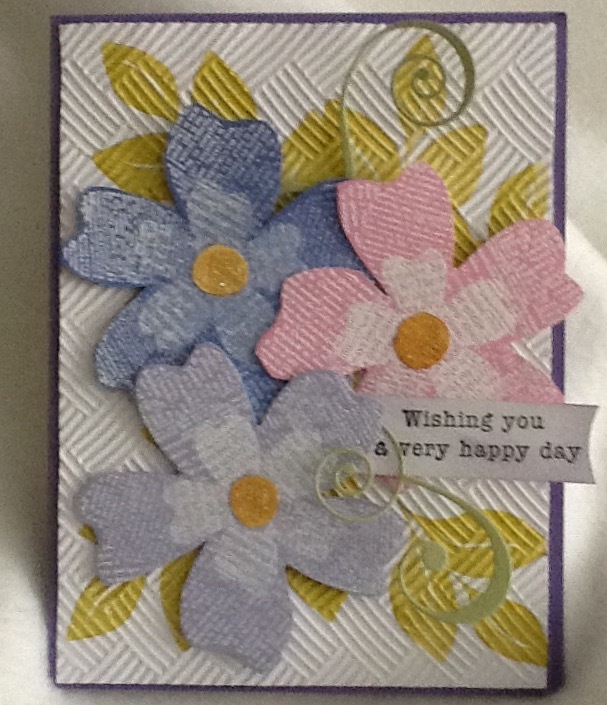 I was inspired by the beautiful flowers and landscape arrangements at the Providence Flower show on Friday. So nice to see flowers in bloom, ponds and flowering trees. I created a card using a newly purchased Hero Arts flower stamp, embossed stamped background and a die cut vine tendril. Think warm sunshine!