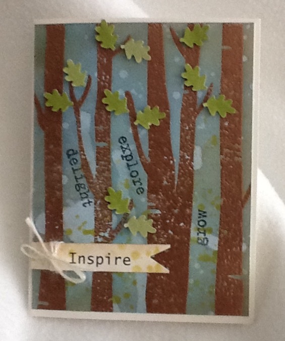 Time to think leaves! I used a Hero Arts tree stamp, one I had used for a Christmas card last year, that I embossed with copper embossing powder, inked with Ranger distress ink, sprinkled on some water and added green leaves using a small leaf punch, added some words and a word banner. Love the way it came out. Check out the post on Splitcoaststampers.com and on Flickr, too. Don’t you love it?!